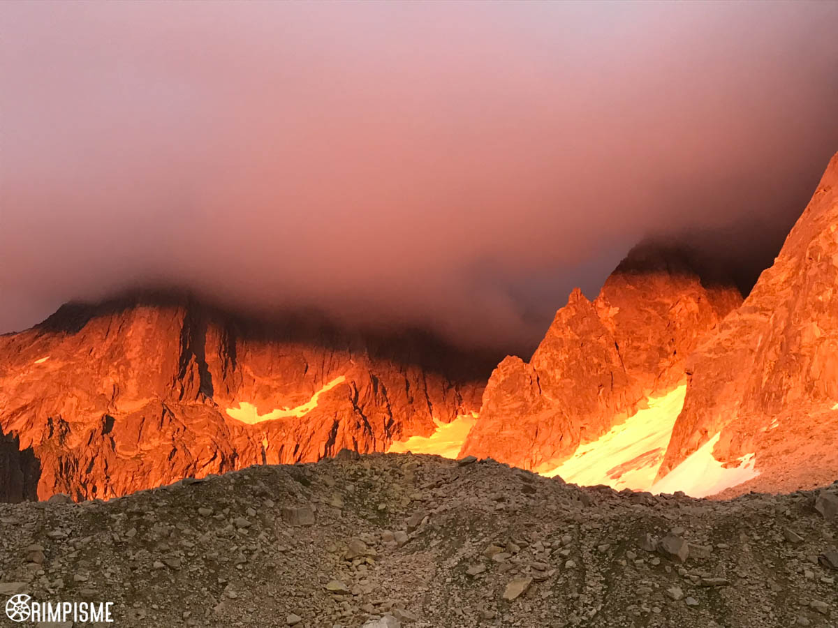 Après un bivouac royal au-dessus du Lac Bleu, nous grimpons cette fois par « Les Lépidoptères » puis l’arête SW, reliant les 2 itinéraires pas une partie de varappe sur la voie normale.