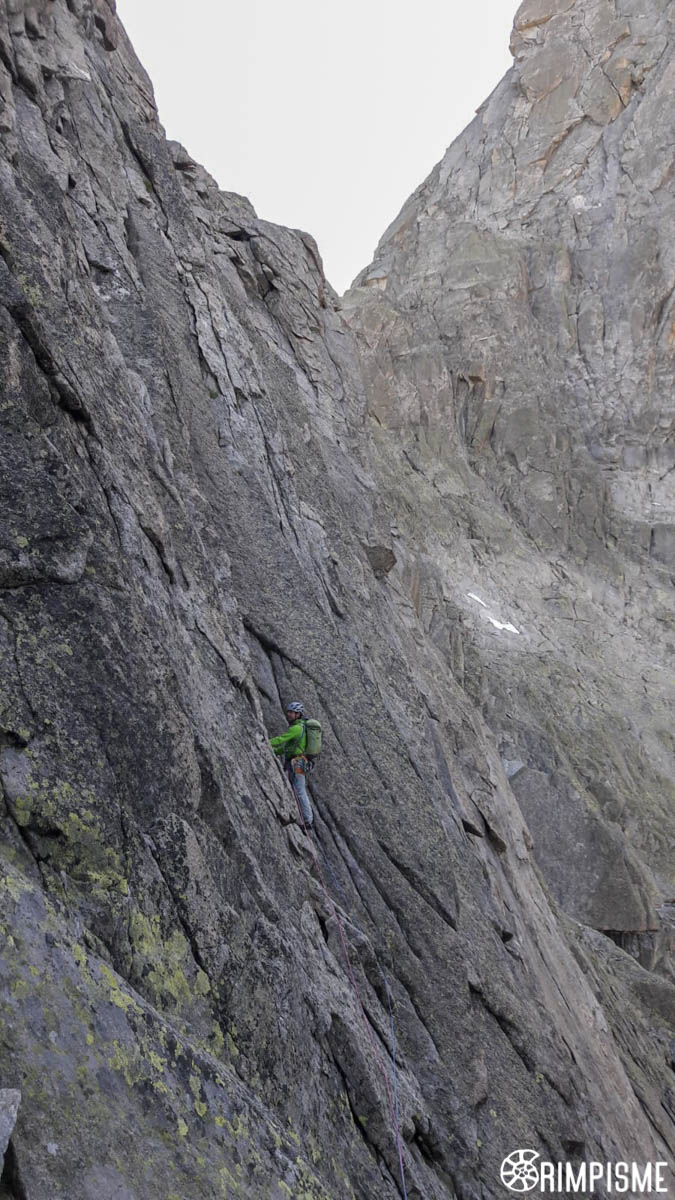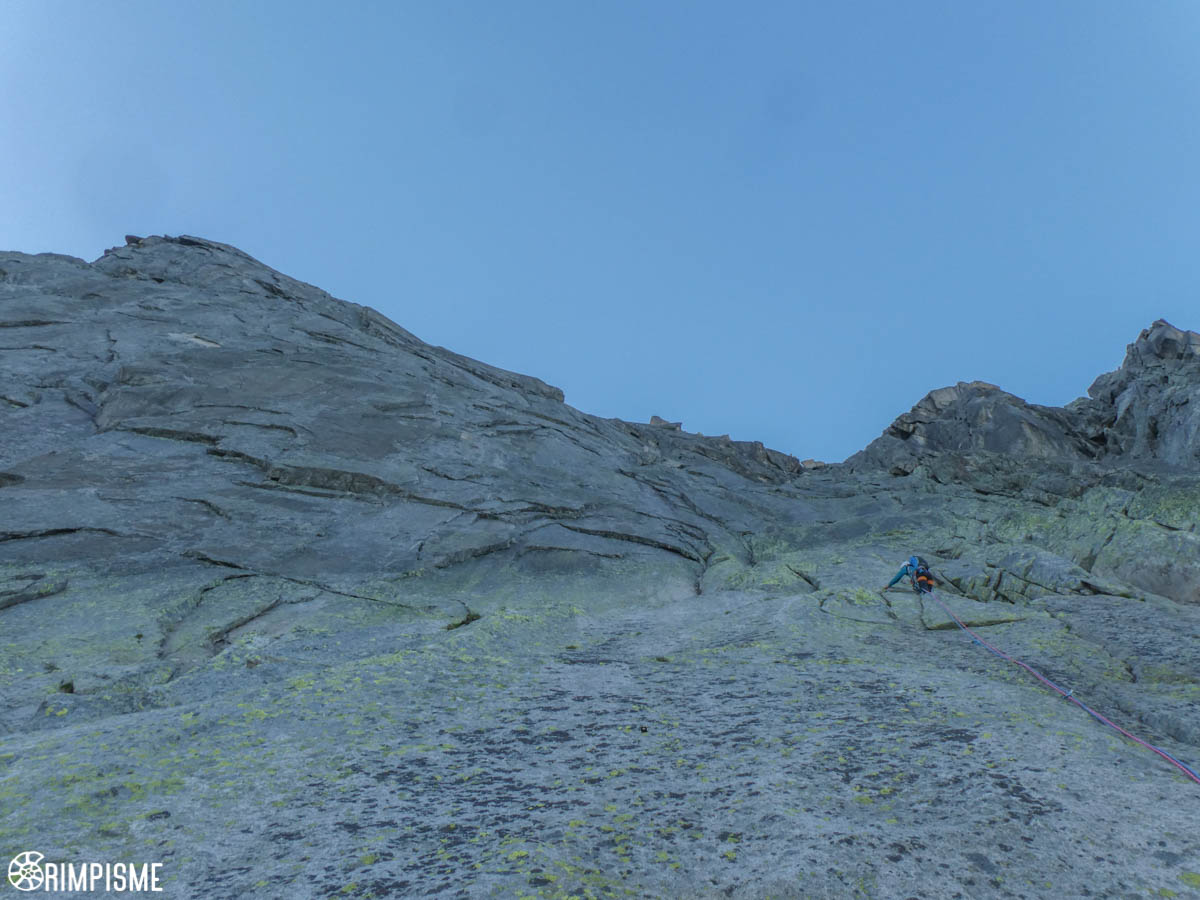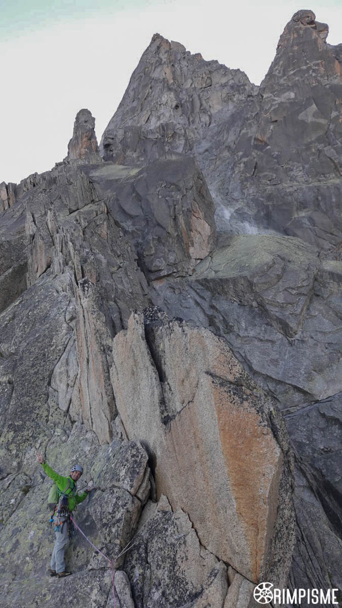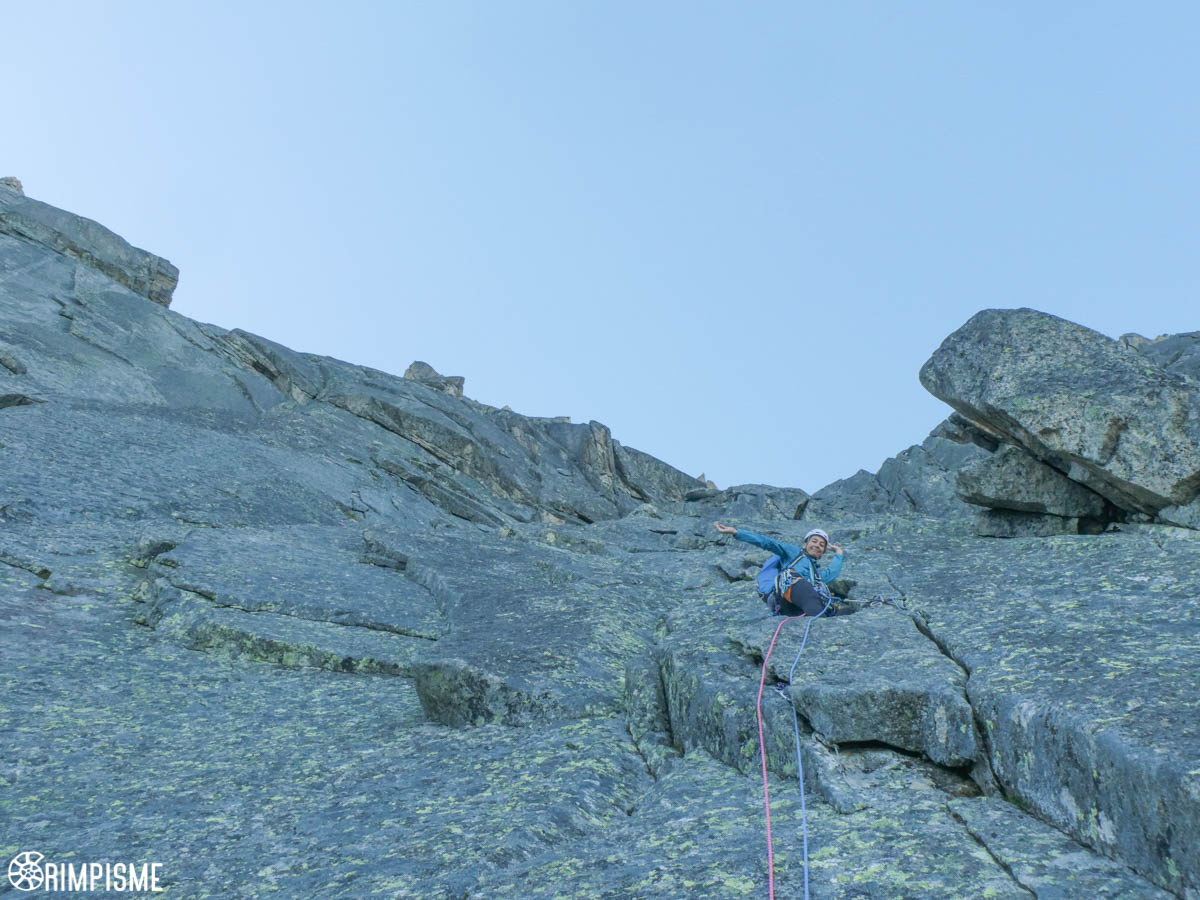 Vient le troisième acte avec l’arête SW que l’on atteint après une longueur sur la voie normale (celle-ci traverse ensuite à droite). L’itinéraire n’est pas toujours limpide et il faut avoir un peu de nez, sans chercher à tirer de trop grosses longueurs avec du tirage. Le granit est fantastique.