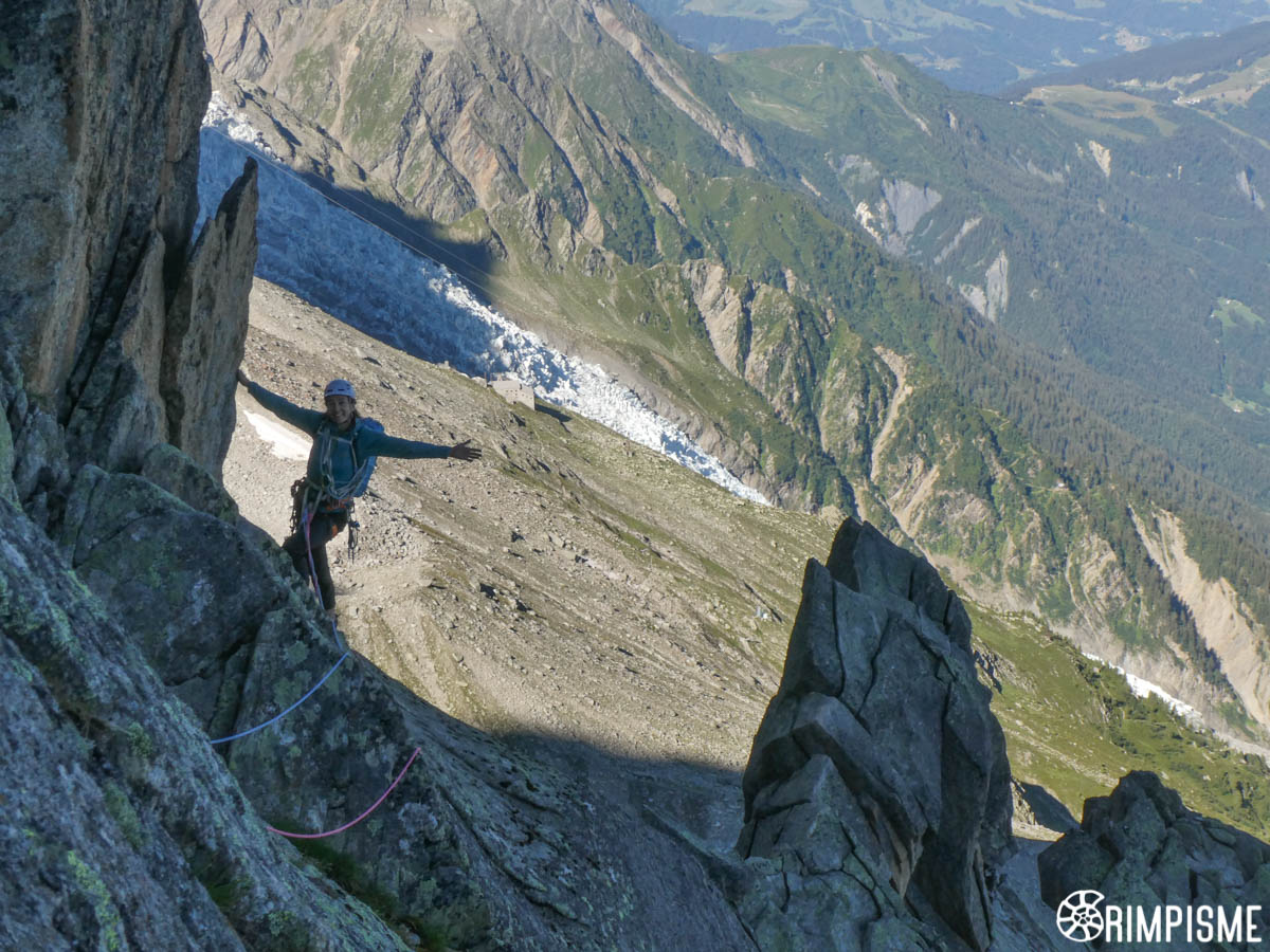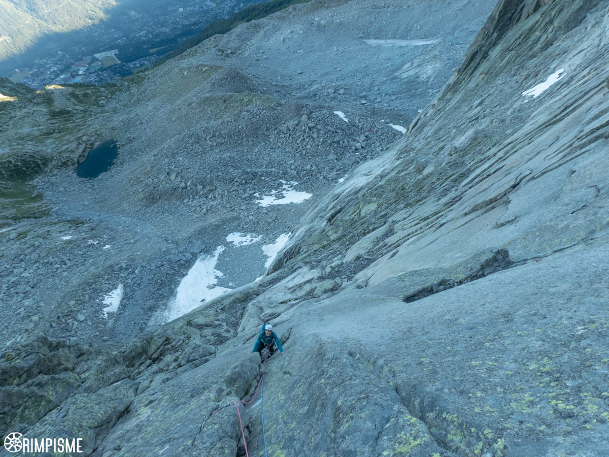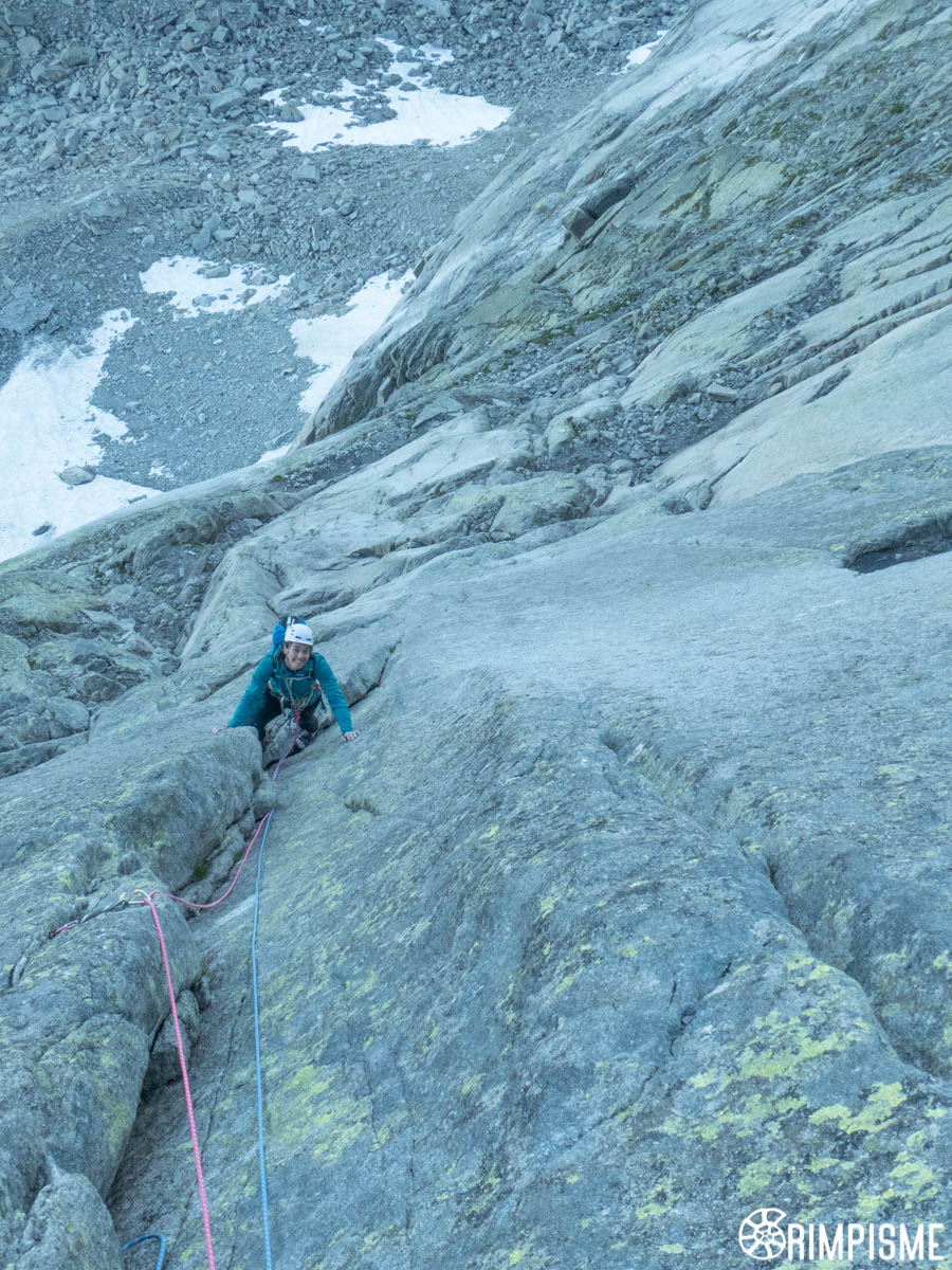 J’étais parti sur trois acte mais la dernière longueur mérite à elle seule un acte. L’acte de cette Fissure Lépiney se joue en quatre scènes. Scène 1 : la double fissure Lépiney. De l’équilibre et ça passe bien. Scène 2 : la cheminée improtégeable (peut être avec un gros Camalot au fond ? j’en avais pas pris de toute manière). Là il faut du culot. Scène 3 : la fabuleuse traversés descendante sur la gauche, facile mais impressionnante, découverte par Terray et Lachenal. On respire c’est incroyablement facile malgré la configuration du caillou. Scène 4 : un belle fissure courte à main puis la sortie facile.