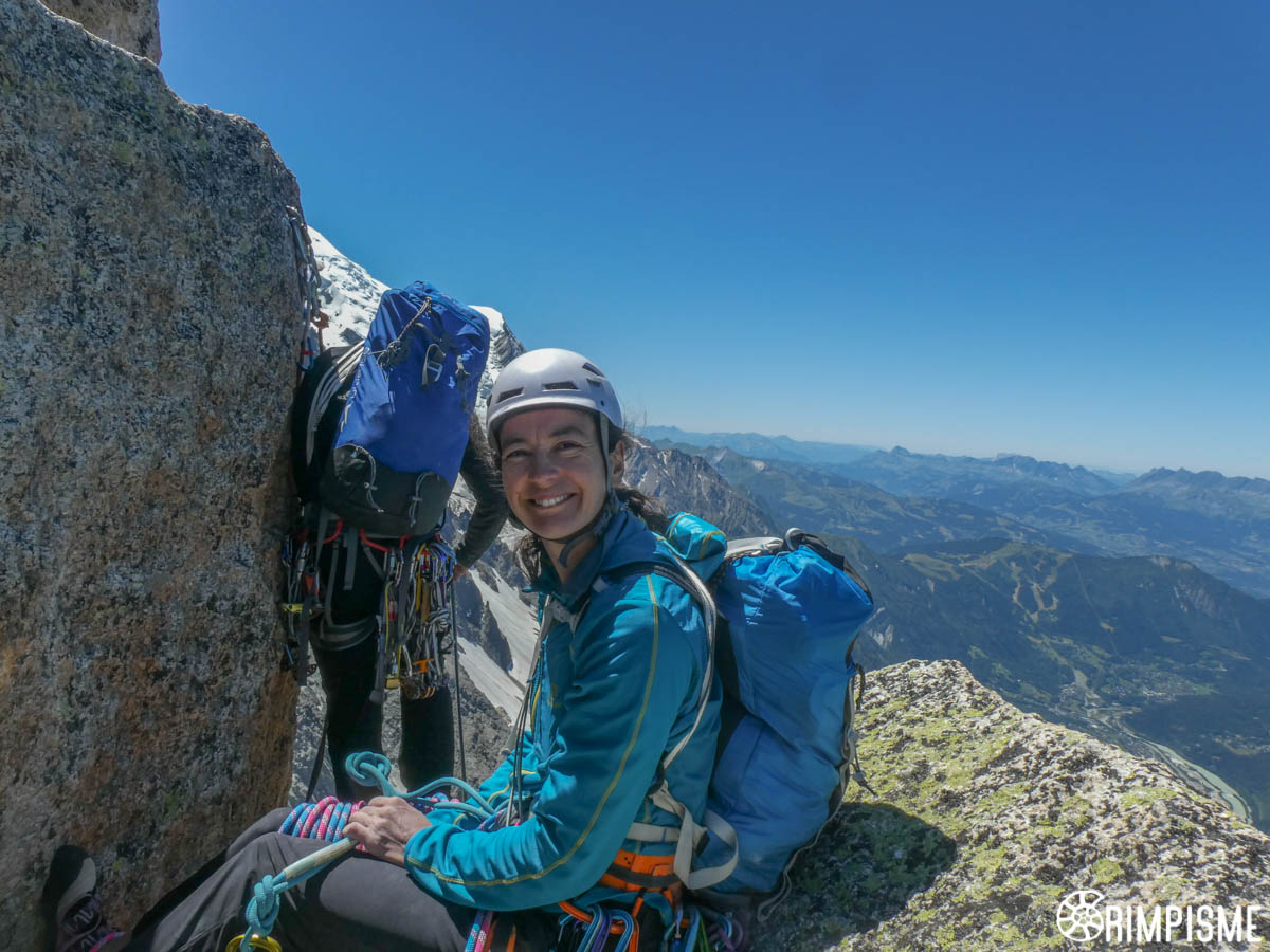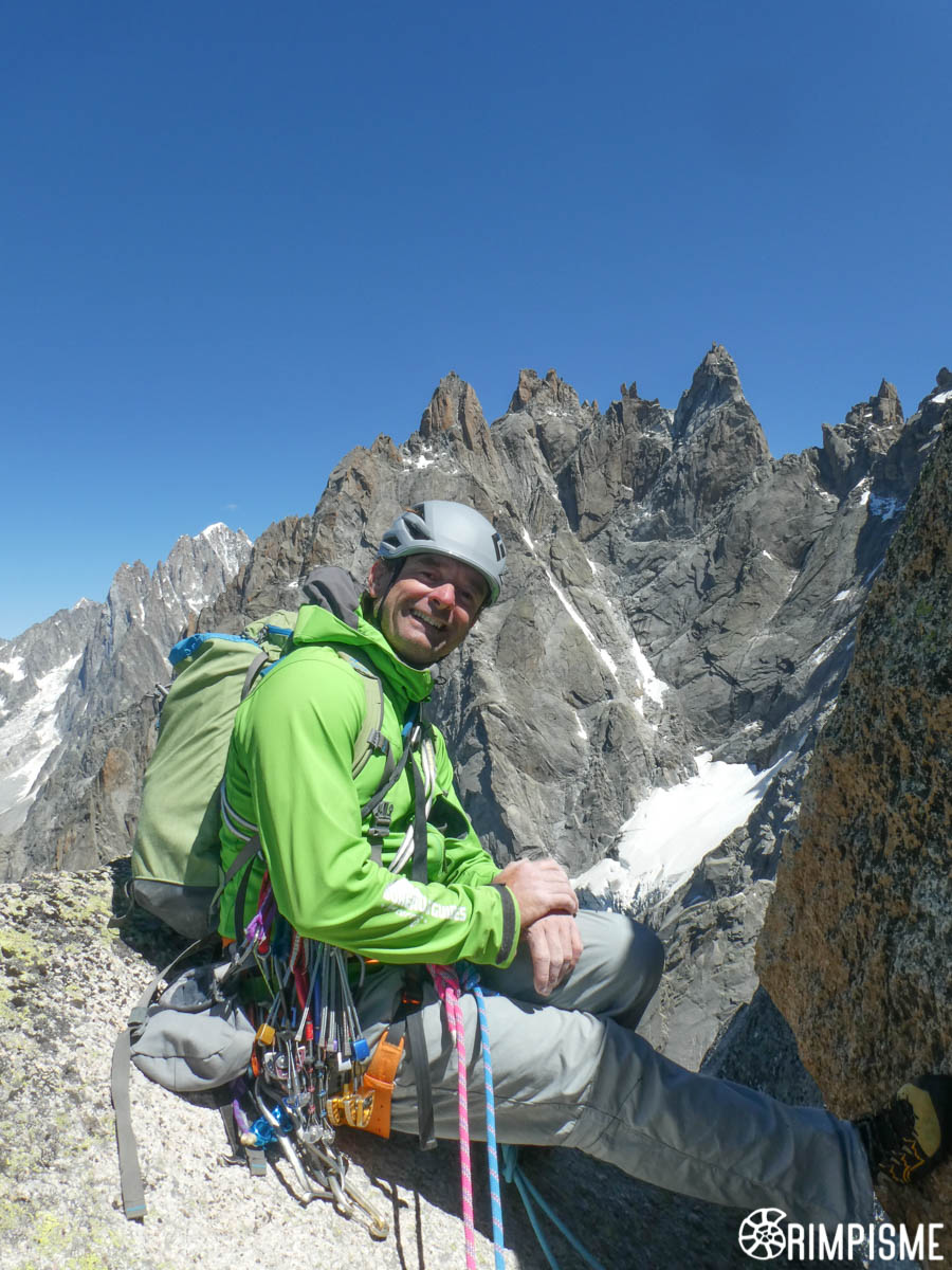 Encore une belle journée là-haut, avec un temps magnifique et peu de cordées croisées finalement. Surtout que des gens sympa ne grimpant pas pour le chrono et/ou les honoraires, comme cela arrive trop souvent (des mauvais souvenirs de la sortie précédente…). Si il fallait mettre un petit bémol, ce serait le bruit trop régulier des hélicos et des avions.