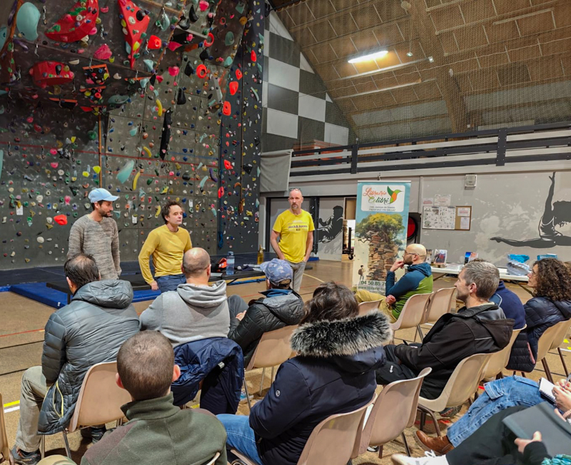 Hier soir des grimpeurs différents, de bloc, de grande voie, de plastique, de compétition, qui filment, qui interviewent. Des forts et des moins bons. La diversité de la grimpe, un lieu de grimpe, d’entraînement, et de rencontre.