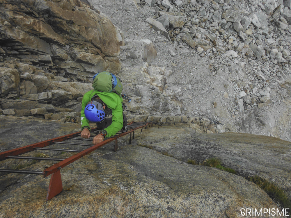 – la première longueur du dièdre en 4c est particulière à grimper, mais est équipée de quelques pitons, d’un cablé coincé, et se protège bien