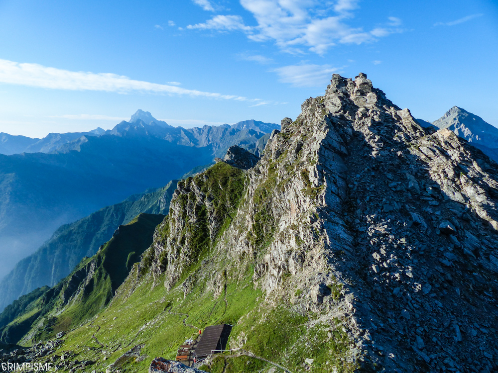 Après un départ à l’aube (6h), nous étions au sommet du Bric Bouchet par l’arête SW à 10h15. Il manque 2 ou 3m à ce sommet(selon les versions) pour atteindre les 3000m mais cette voie est plutôt jolie et intéressante. Le rocher est bon, la ligne belle, l’assurage montagne à mettre en oeuvre est intéressant et évident. Une cheminée en 4 demande de regarder le bout des grosses, sinon ça déroule.