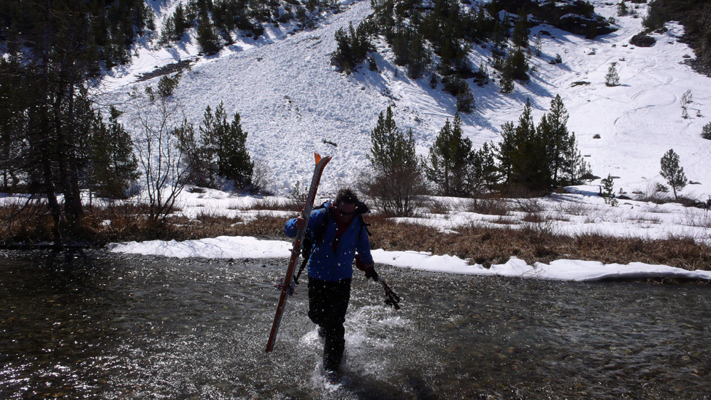 La descente n’était pas pire du tout, si on exclut le passage herbeux de la crête sommitale et la neige lourde sans fond des 100 derniers mètres. On a même réussi à faire quelques traces dans les creux ou le vent avait accumulé un peu de neige fraiche.