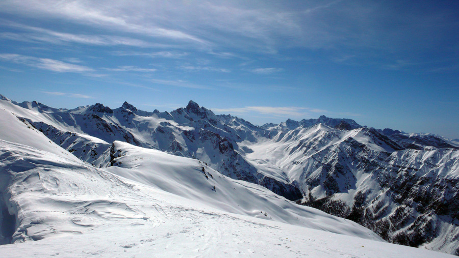 La montée par le Pic Cascavelier et la crête est vraiment très belle, entre Viso et Fond de Sancte. Quand au couloir il n’est pas très raide mais c’était un peu chargé par endroit, bonne ambiance. La neige était bien poudre avec souvent un fond dur dans l’axe et plus profonde sur les rives avec quelques accumulations, méfiates…