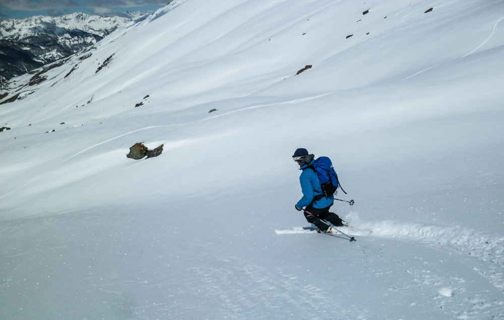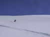 La quantité de poudre très légère augmentait progressivement avec l’altitude, posée sur une croûte de regel pas forcément épaisse mais suffisante. Seuls les 20 derniers mètres avant la crête m’on fait hésiter car la fraîche reposait sur un fond non transformé qu’on sentait fragile sous les pieds.