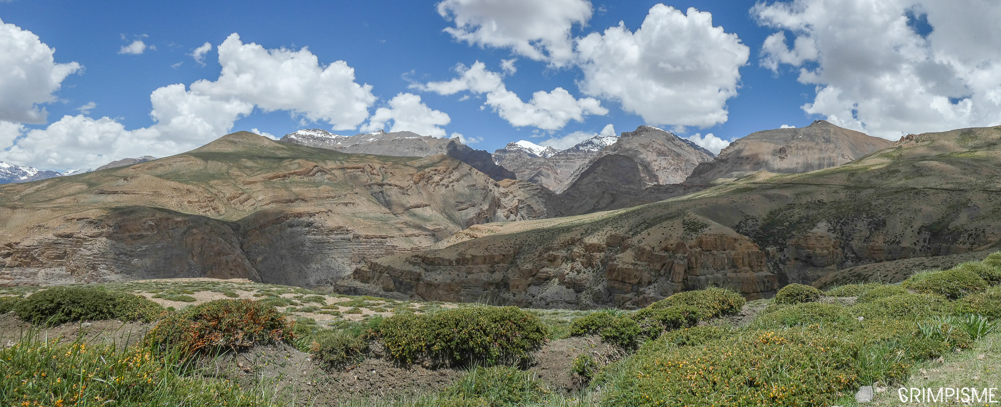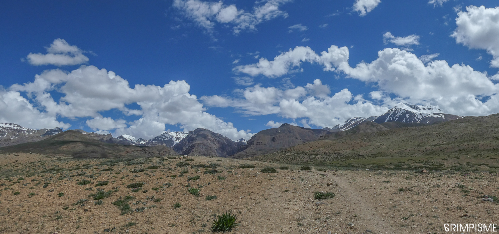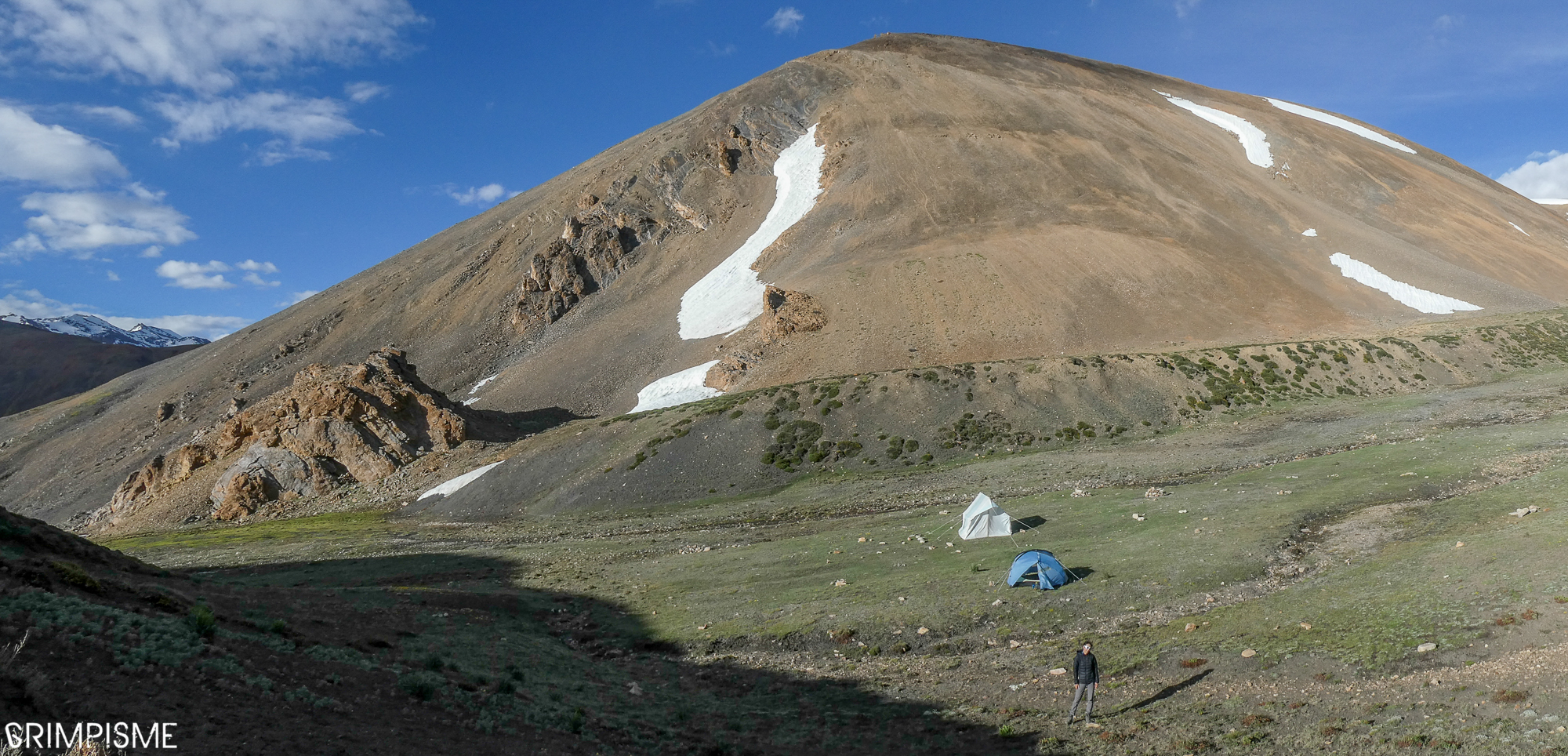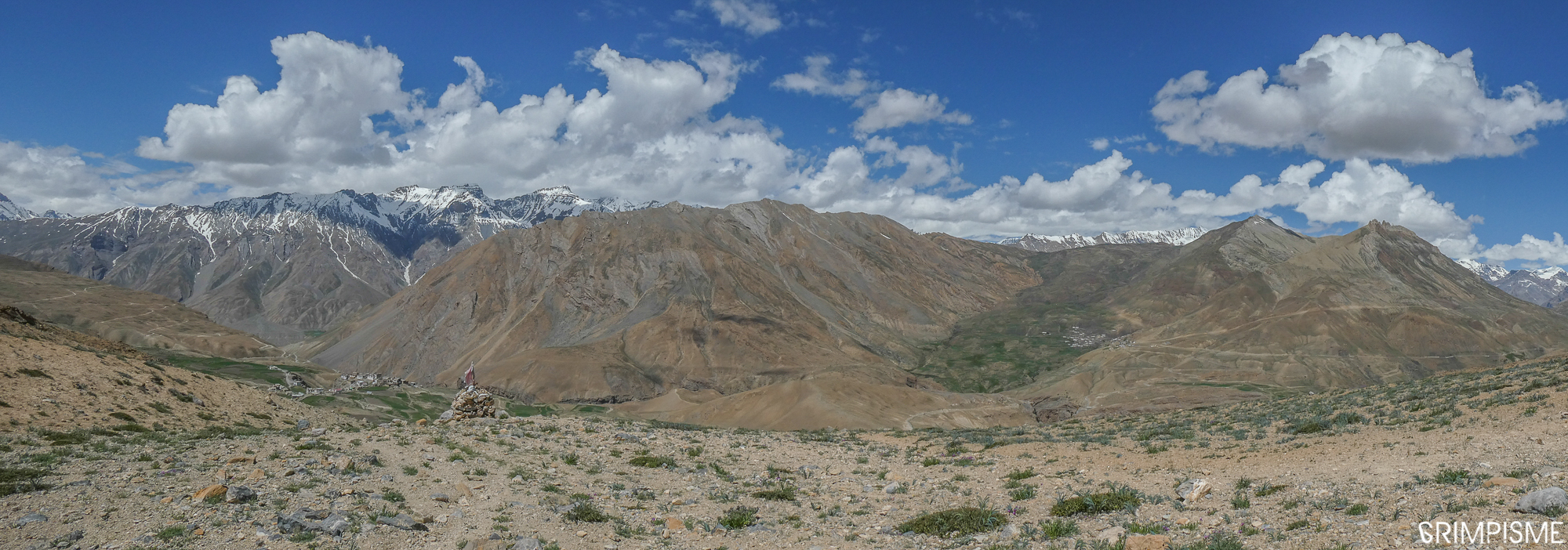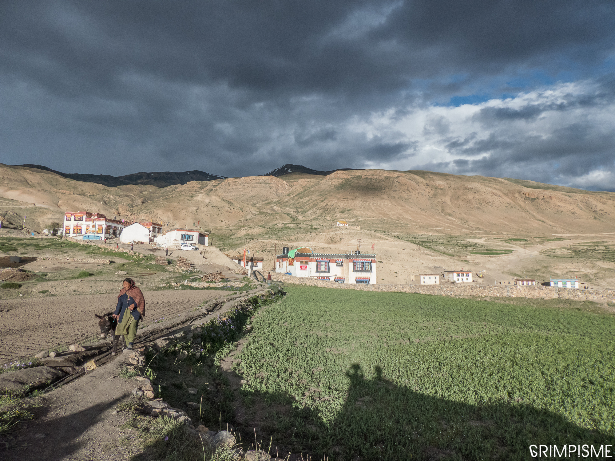 Après avoir pris un taxi, nous arrivons à Kibber. L’ex « plus haut village habité du monde » (4270m) est un perchoir magnifique en rive gauche de la vallée. On y trouve peu de possibilités de logement ouvertes et il ne faut pas s’attendre à être accueillis les bras ouverts. C’est l’ambiance tibétaine avec les paysages qui vont avec, et ça a son charme. Nous sommes ici pour faire l’ascension du Kanamo, un presque 6000m facile au dessus du village. Nous n’avons plus le temps de traverser le Parang La vers le nord. Le Kanamo ne devrait nous prendre que 2 jours, ce qui nous laissera le temps de trainer au Kinnaur après ça. En passant par la Norling Homestay, nous réservons un guide avec une mule et un muletier/cuisinier pour le prix exorbitant de 10.000 roupies indiennes pour 2 jours et une nuit. D’une part nous sommes prêt à payer pour vivre une nouvelle aventure humaine et montagnarde. D’autre part nous n’avons pas acheté de kérosène pour le réchaud à Kaza, trop confiants après un début de voyage qui est passé comme sur des roulettes. On aurait du se méfier avec le fils des propriétaires du lodge, qui a organisé pour nous ces 2 journées. Pressant, insistant, changeant toutes les 10 minutes de version dans ses explications, sa fausse politesse est exaspérante.