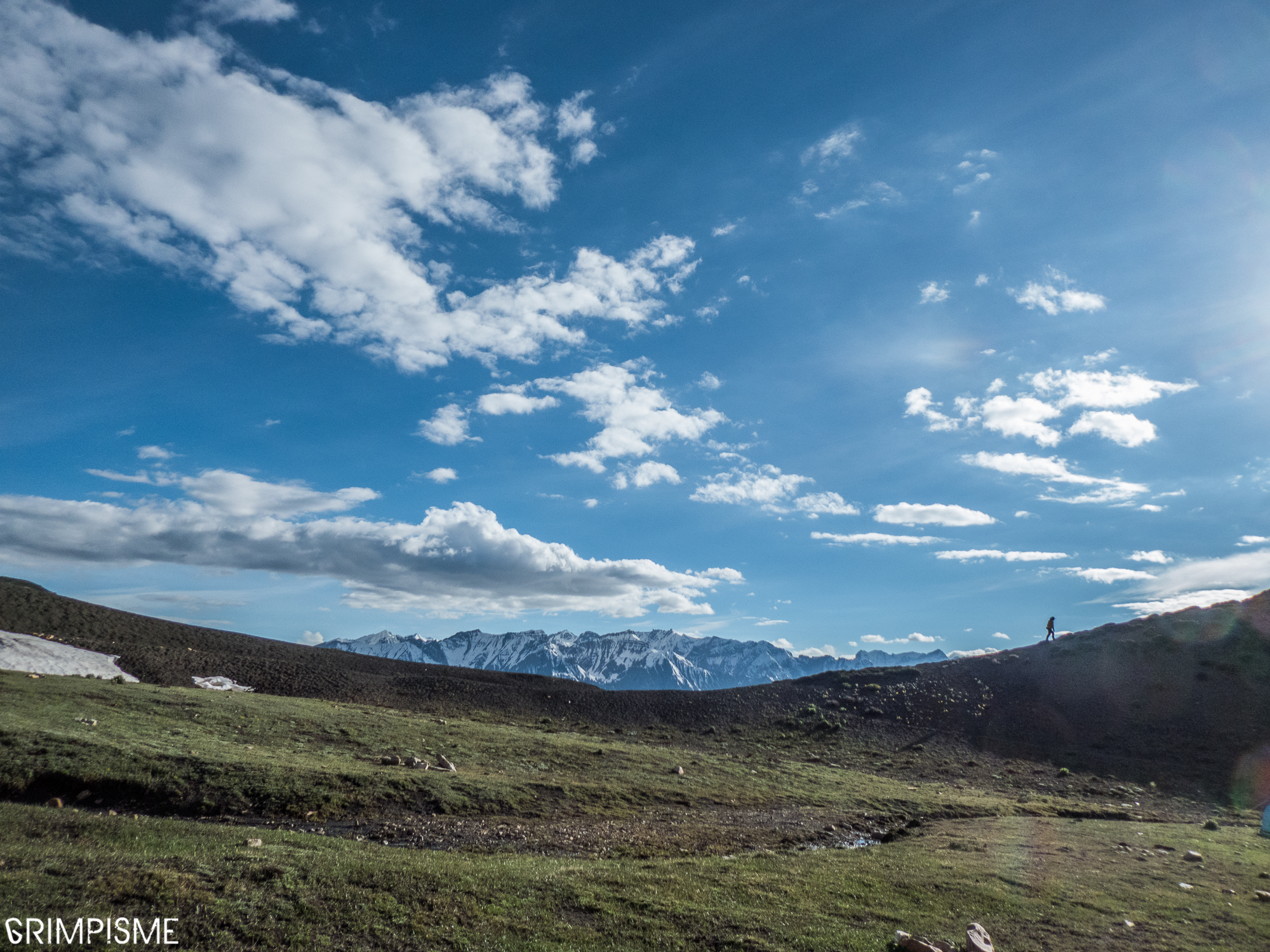 Nous voilà partis pour une marche facile de 3h vers le camp de base. Le temps est couvert, ce qui est plutôt agréable car le soleil tape fort en juillet à cette altitude. Le guide doit avoir 65 ans environ, plutôt bedonnant. Avec son mauvais anglais il nous raconte sa vie de « grand himalayiste qui passe à la BBC et a pour meilleur ami un guide suisse ». Je ne peux pas vous donner son prénom car il ne nous l’a pas dit, ni n’a demandé les nôtres. D’ailleurs il n’a absolument rien demandé sur nos vies, pas la place dans la sienne. Tout ça on ne le réalisera que le lendemain. Nous sommes en vacances et on ne se prend pas la tête. Surtout qu’il prend le temps de nous parler des fleurs que nous rencontrons sur le chemin et nous montre des traces de leopard des neiges. Un beau et long coucher de soleil puis un repas hyper basique concluent une journée tranquille.