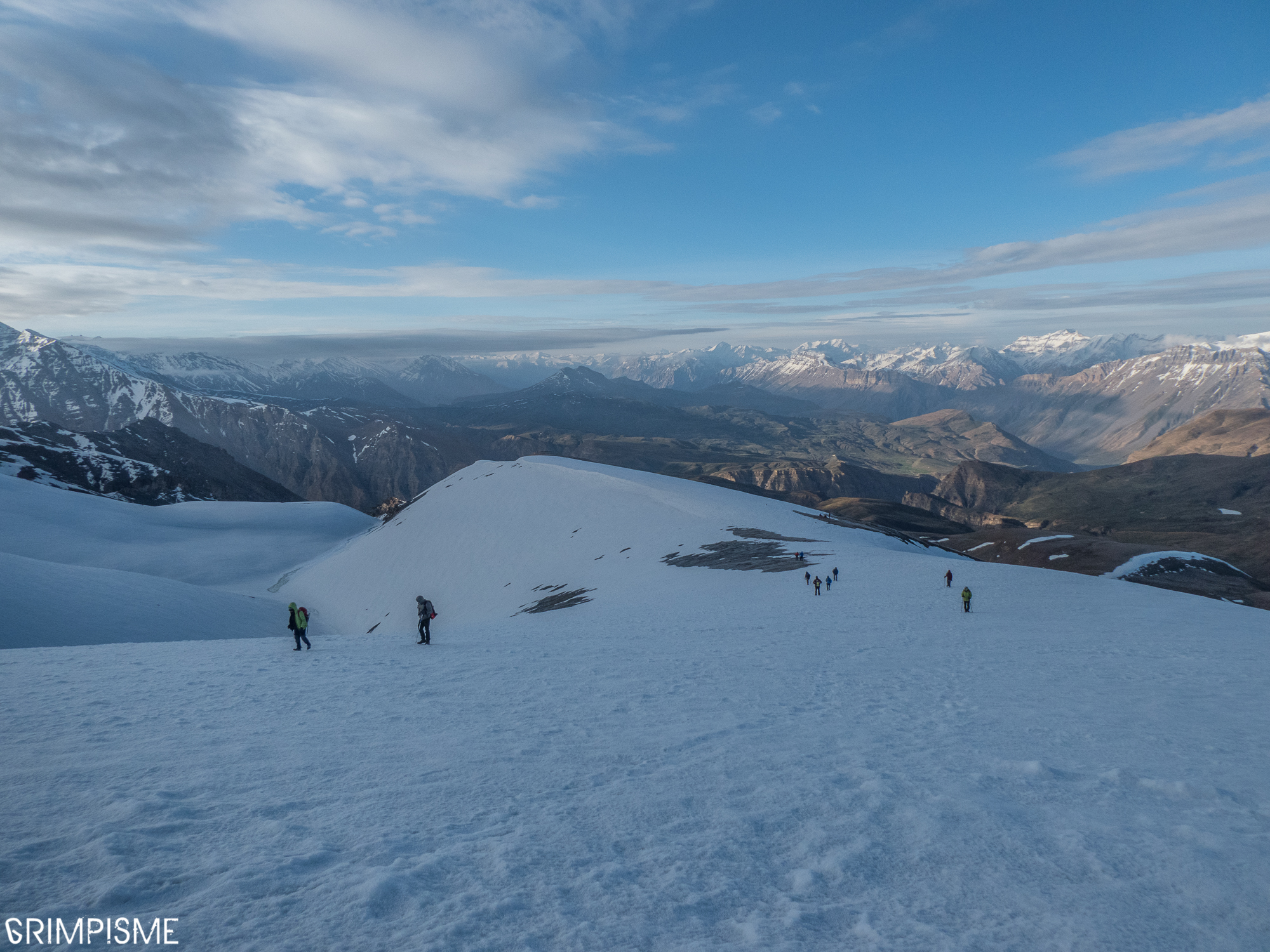 Après un petit déjeuner minimaliste et limite mangeable, nous partons à 4h15 du camp. Après un lever de soleil inoubliable, nous découvrons une immensité de montagnes vers le nord et le Changtang tibétain. L’ascension se jouent sur 2 pentes bien raide, la dernière étant la plus dure. Elle sort à 5970m environ sur l’arête, là où nous nous arrêterons au niveau d’un gros cairn. Ce type de pentes en gravier désagréable me rappellent le volcan Parinacota en Bolivie, en beaucoup plus court heureusement, et sans pénitents lorsque nous marchons sur la neige.
