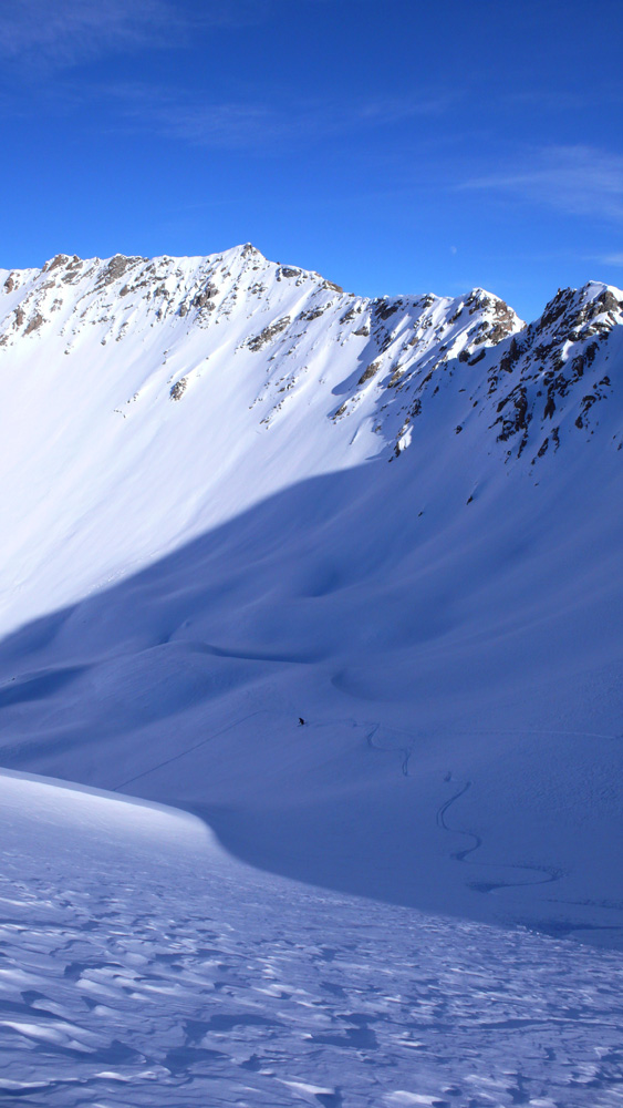 Dur dur avec les fats montés en Diamir, va falloir sortir plus régulièrement pour prendre la caisse. J’ai du les mettre sur le sac pour sortir le haut de la face nord et ça m’a bien calmé (6kg la paire). Par contre à la descente on a pu poser des grandes courbes, le bonheur!