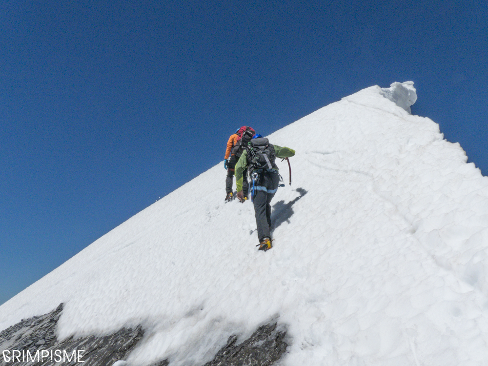 Une arête évidente entre le sommet suisse et le sommet français, facile si déneigée, qui peut être étroite et cornichée en début de saison.